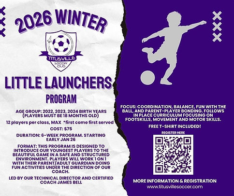The all new TSC "Little Launchers" Program is designed to introduce our youngest players to the beautiful game in a safe and structured environment. For players born in 2022, 2023, and 2024 (must be 18 months old). Led by our Technical Director and certified coach James Bell